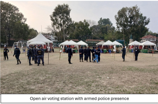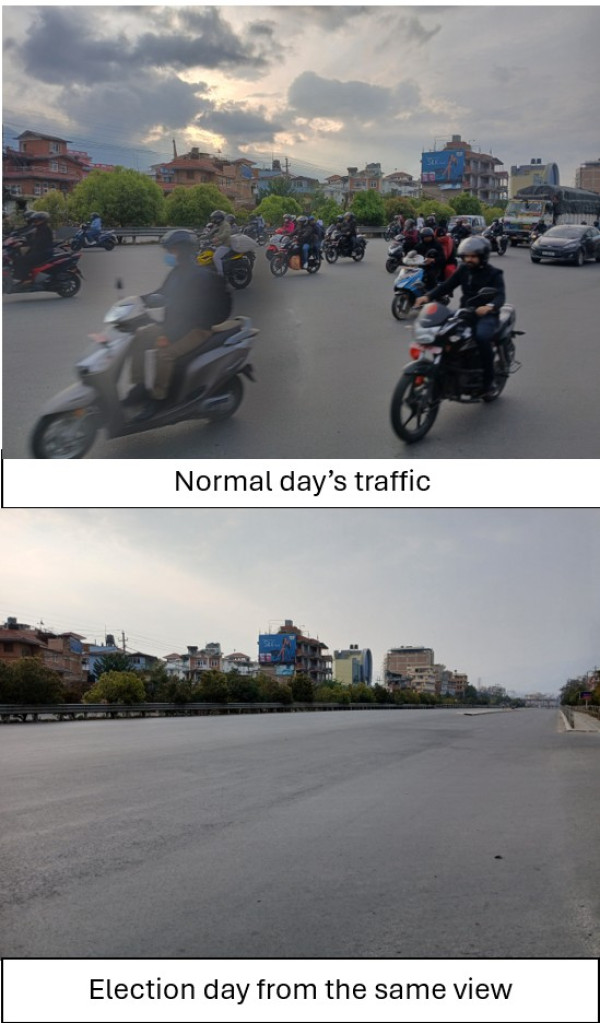 The days leading up to the election were a little tense but passed off without any serious violence. The interim government declared a three-day holiday in the week of the election to allow people to travel to their home-town, which is where votes had to be cast. It is estimated that about 800,000 people left Kathmandu to return home, making the streets of the city nice and quiet but the roads out of town very busy! On the day of the election itself no motor vehicles were allowed on the roads (we're not really sure why). You'll see from the photos that it made for a very different experience when we went out for a walk. There was a heavy armed police presence around each voting station. The nearest one to us was on a local football ground in the open.