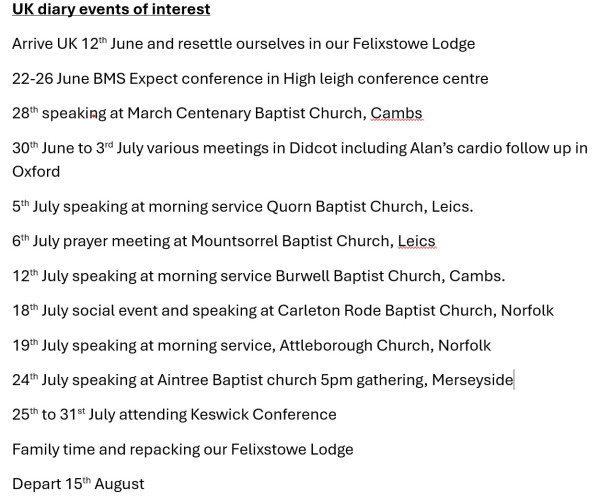We'll be in the UK this year from mid June until mid August. Our church visits are already booked up, so we look forward to seeing some of you. We've included our diary so you can see where we will be and when during this visit.
